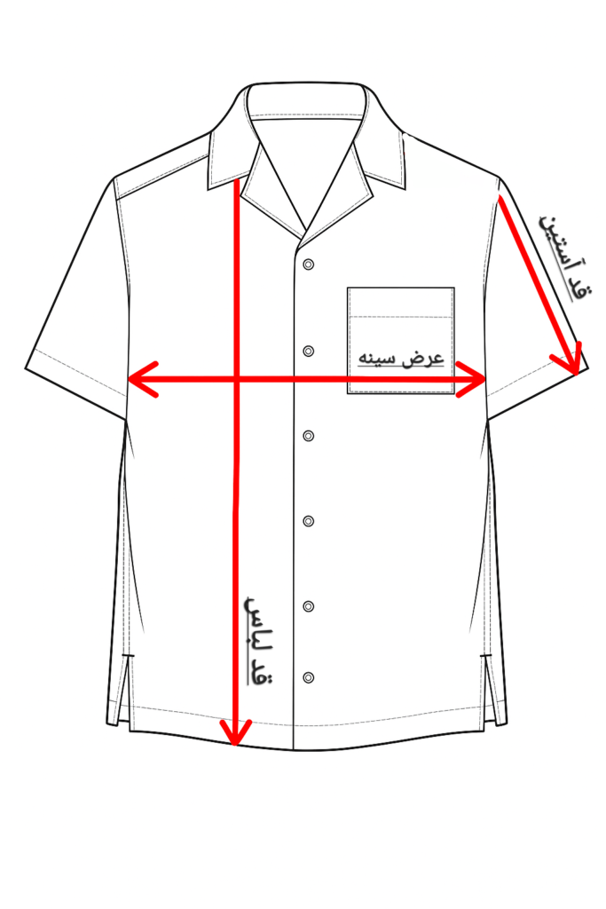 عرض سینه: متر را از زیر یک بغل (حلقه آستین) به زیر بغل دیگر لباس بکشید. در صورت اندازهگیری روی بدن، پهنترین قسمت سینه را اندازه بگیری.